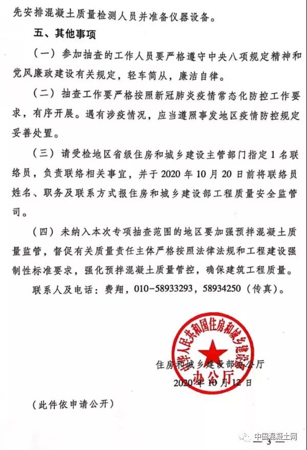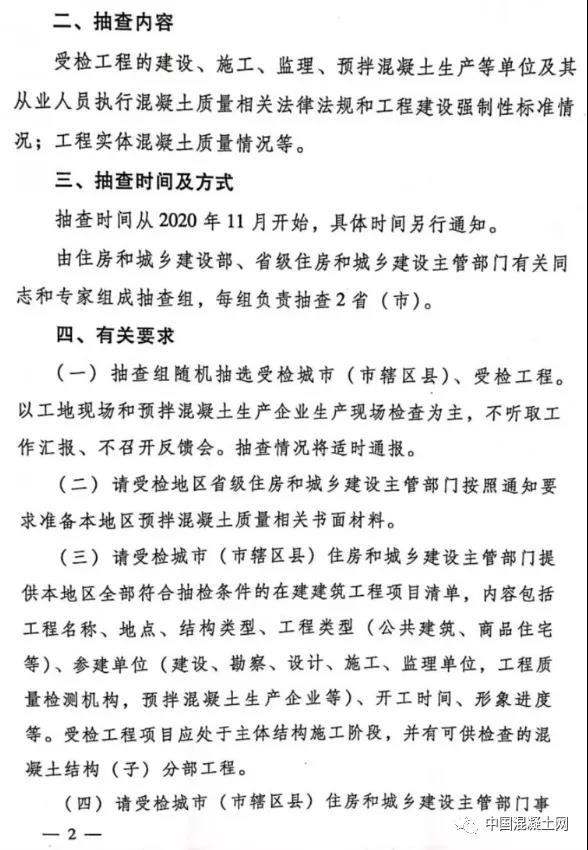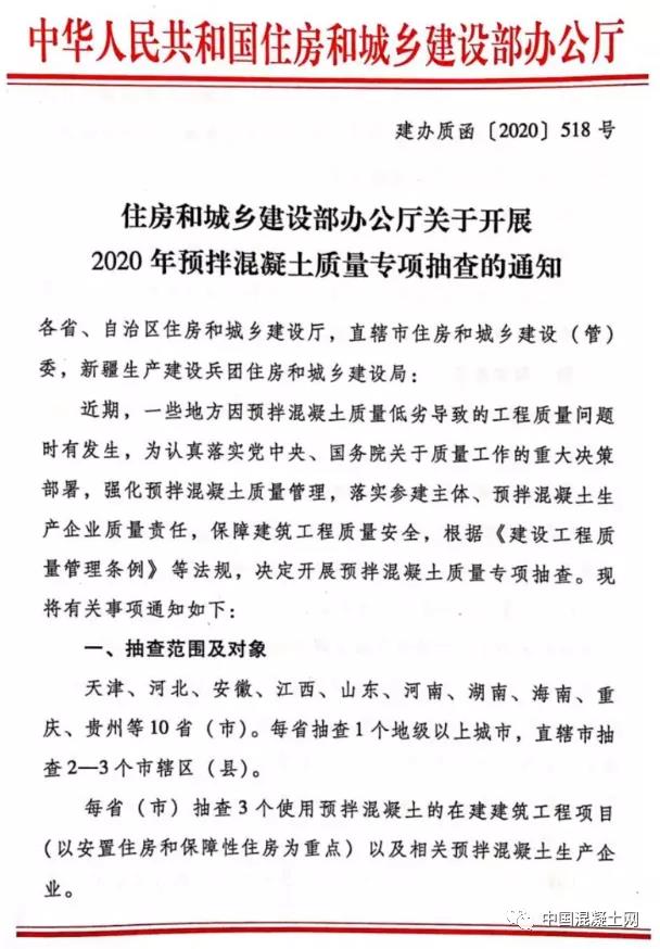 日前,住房和城鄉(xiāng)建設(shè)部辦公廳發(fā)布關(guān)于開展2020年預(yù)拌混凝土質(zhì)量專項(xiàng)抽查的通知稱:近期,一些地方因預(yù)拌混凝土質(zhì)量低劣導(dǎo)致的工程質(zhì)量問題時(shí)有發(fā)生,為認(rèn)真落實(shí)黨中央、國務(wù)院關(guān)于質(zhì)量工作的重大決策部署,強(qiáng)化預(yù)拌混凝土質(zhì)量管理,落實(shí)參建主體、預(yù)拌混凝土生產(chǎn)企業(yè)質(zhì)量責(zé)任,保障建筑工程質(zhì)量安全,根據(jù)《建設(shè)工程質(zhì)量管理?xiàng)l例》等法規(guī),決定開展預(yù)拌混凝土質(zhì)量專項(xiàng)抽查,現(xiàn)將有關(guān)事項(xiàng)通知如下: